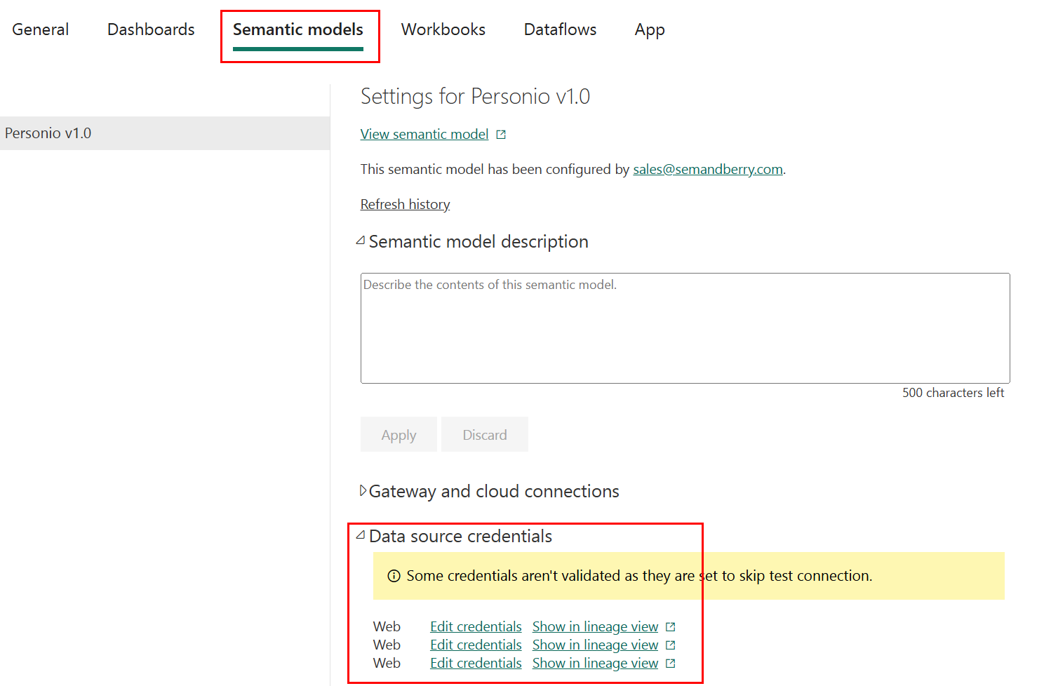 If the Settings page opens directly after clicking the app, you can skip this step and proceed to Step 5. - On the Settings page, go to the Semantic models section and click Data source credentials.